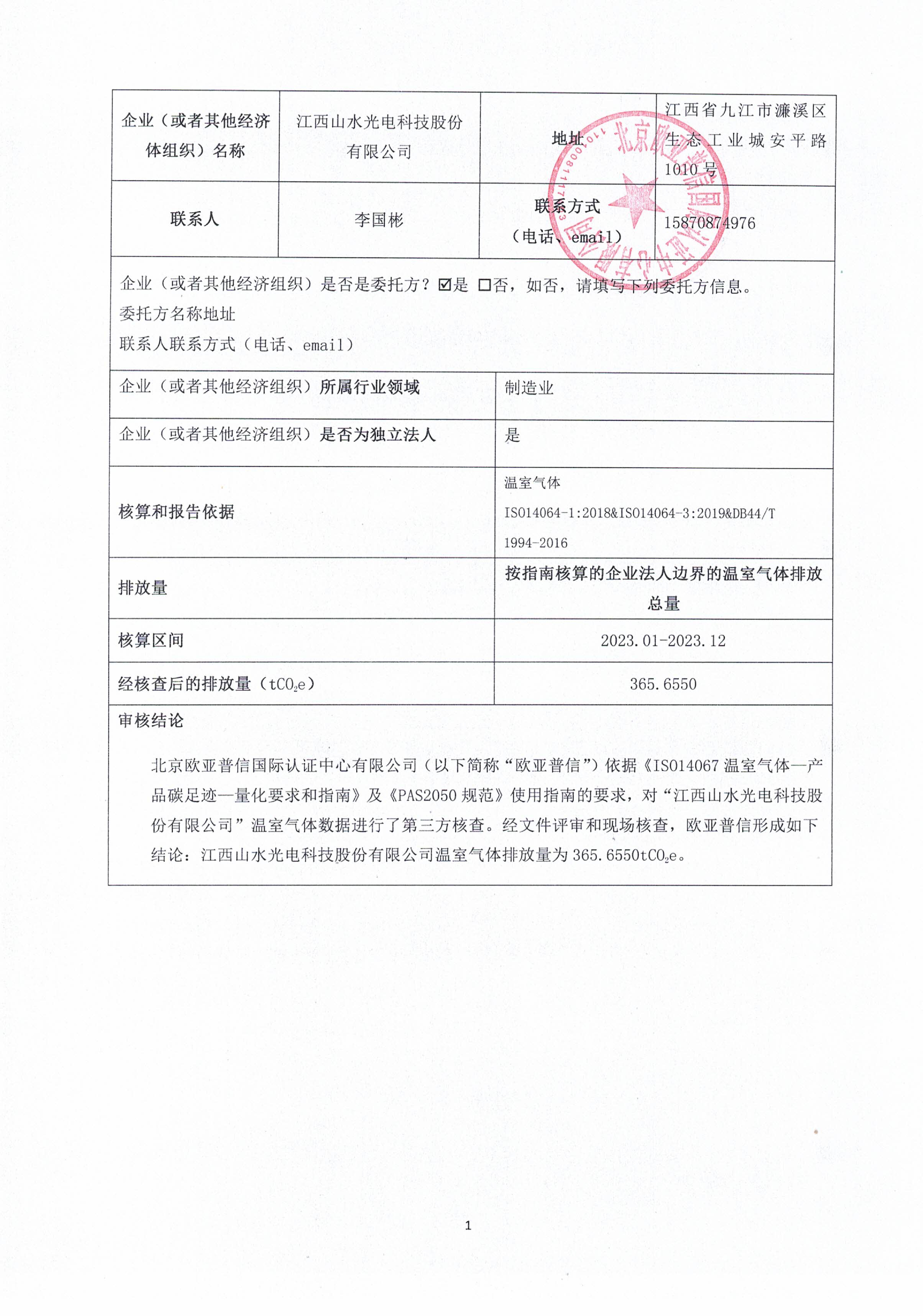 江西山水光电科技股份有限公司2023年度温室气体已通过北京欧亚普信国际认证中心核查并认证,相关证书和报告如下: